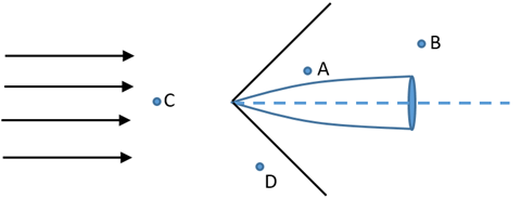 Explaination : When a conical body is placed in a supersonic flow, there is a formation of shock waves. When the points lie within the Mach waves, the disturbances introduce are felt otherwise it is not. Since point A and B lies inside the Mach wave, any perturbations will be felt at these two points.