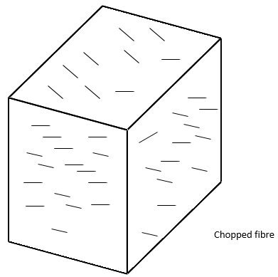 Explaination : Above diagram is showing a typical whisker reinforced composite material. Short strand of the reinforcing materials are randomly located throughout the matrix. Chopped Fiberglass is an example of such arrangement.